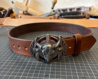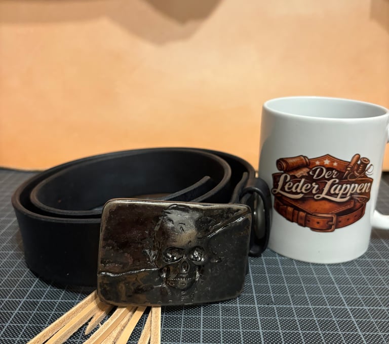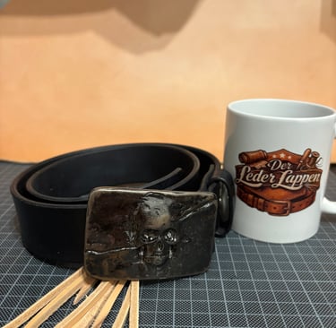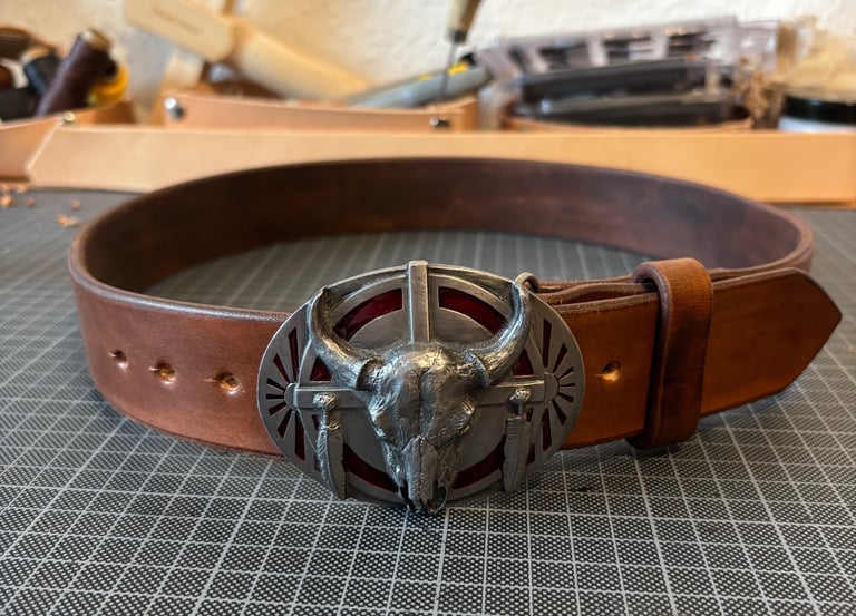 Handgefertigt aus vegetabil gegerbtem Rinderleder. Lederstärke ca. 4 mm. Die Gürtelbreite richtet sich nach der Schnallenausführung.
