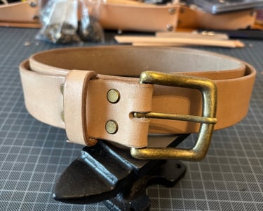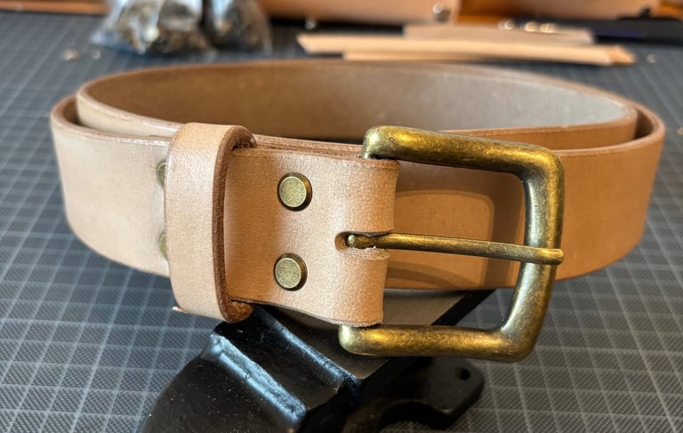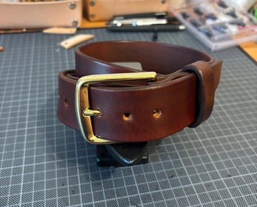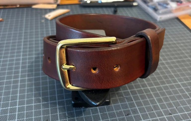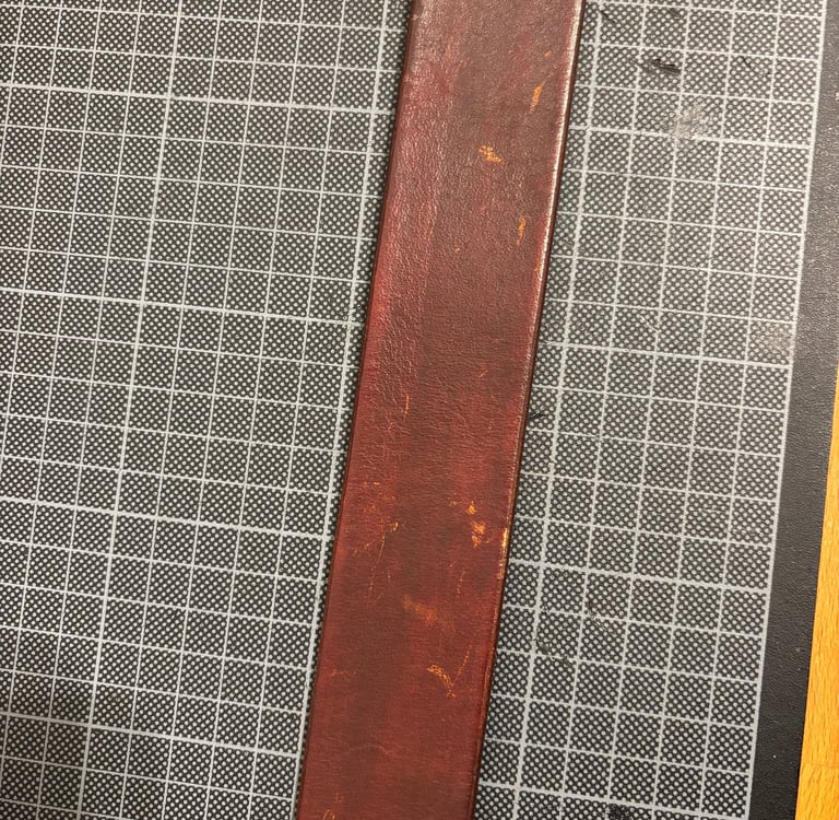 Handgefertigte aus vegetabil gegerbtem Rinderleder. Lederfarbe Dunkelbraun mit massiver Messingschnalle. Der Gürtelriemen hat leichte Optische Mängel, die Funktion und Haltbarkeit ist nicht im geringsten eingeschränkt.