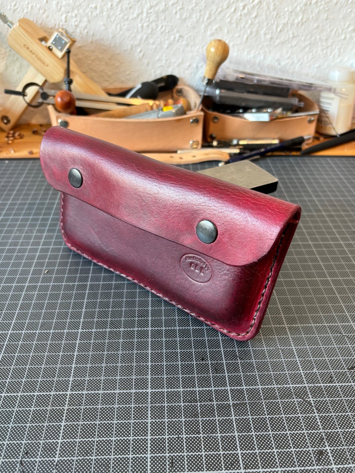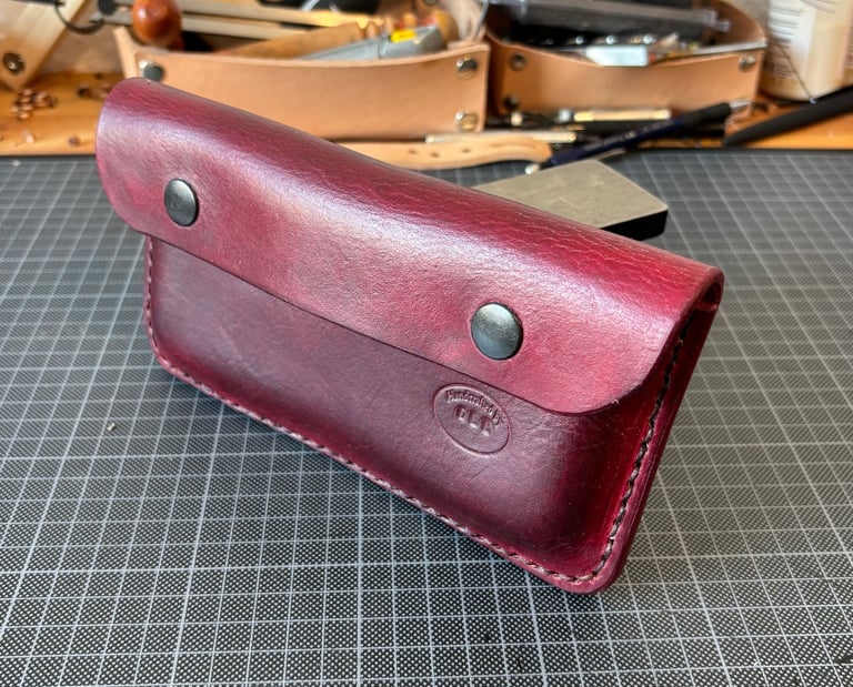 Hier durfte ich für einen Kunden eine Smartphone-Tasche die Arbeit herstellen. Die Tasche kann man quer am Gürtel festmachen. Sie ist aus vegetabil gegerbtem 4,0 mm Rinderleder gefertigt und in der Farbe Ochsenblut gefärbt. Durch die Lederdicke ist der Vollständige Schutz Des Smartphones gewährleistet.